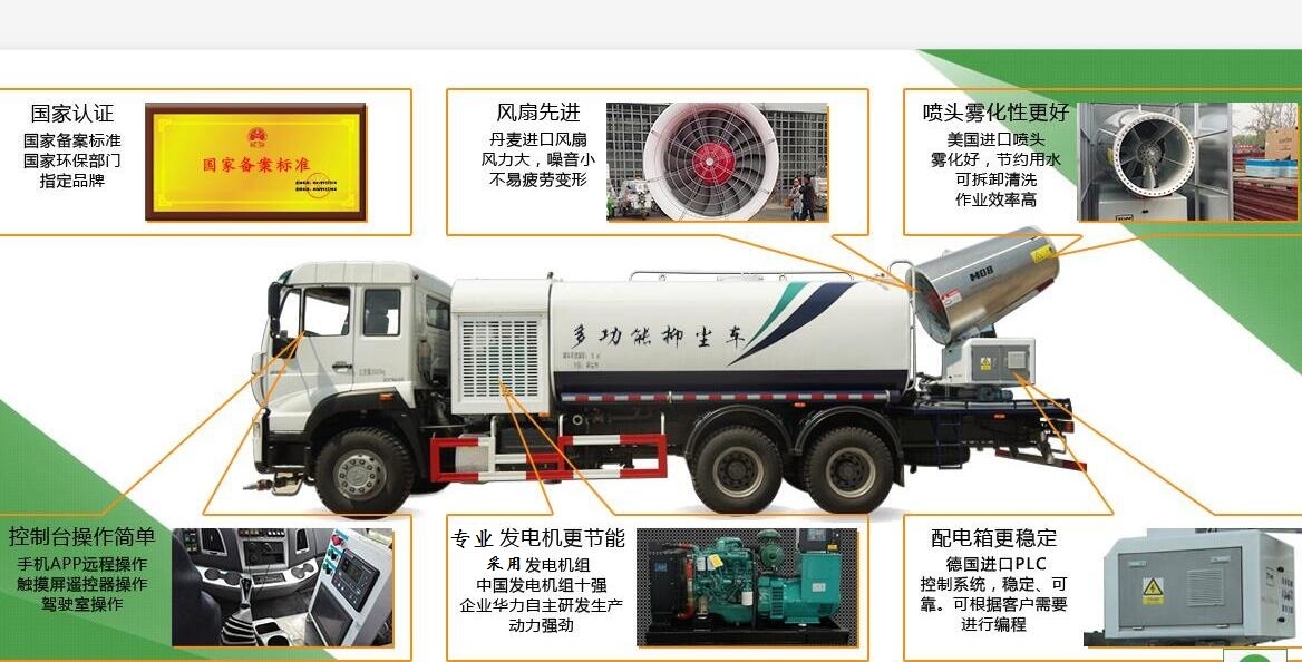 重汽后雙橋16方多功能抑塵車又稱:多功能抑塵車、降塵車、霧炮車、空氣凈化車。主要是在灑水車的基礎上,增加了遠距離噴霧抑塵系統(tǒng),對治理工業(yè)粉塵污染、汽車尾氣、秸稈燃燒等產(chǎn)生在空氣中的細小懸浮顆粒有顯著的效果,被人們成為“治霾神器”。多功能抑塵車主要作用是噴霧抑塵,同時具備灑水和道路沖洗功能,還可進行工地降塵、環(huán)保除塵、空氣凈化等作業(yè)。風送式噴霧大炮可達30-120米不等,霧炮筒可360°旋轉,可遙控操作。操控方便,移動靈活。