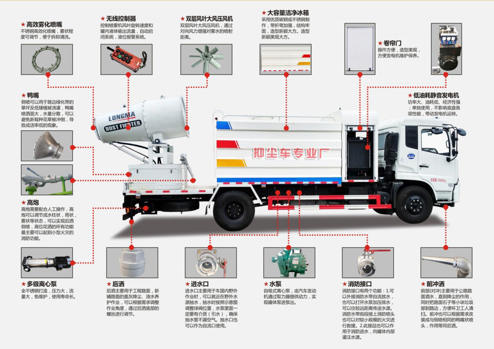 噴霧抑塵車、多功能噴藥車集綠化灑水和噴藥殺蟲功能于一身,采用新型的風(fēng)進(jìn)式噴霧方式是一種高射程高效率機(jī)動(dòng)性好的新代植保機(jī)械配有噴霧裝置,可上下左右移動(dòng),藥液經(jīng)水泵加壓和風(fēng)機(jī)二次秀化可對(duì)園林行道樹、綠化帶、垃圾場、收集點(diǎn)等進(jìn)行噴藥殺蟲,霧化距離高可達(dá)50米;對(duì)物體有較強(qiáng)的穿透力和藥液附著力、能有效地節(jié)約用藥量和減少污染。解決常規(guī)噴藥植保機(jī)械射程不高霧化效果差工散藥液流失嚴(yán)重,既影響殺蟲散率又污染了生存環(huán)境的問題,除適用于樹木的病蟲害防治作業(yè),也可進(jìn)行噴酒化學(xué)除草劑及衛(wèi)生防疫等工作,解決了傳統(tǒng)作業(yè)效率低,工作條件差費(fèi)藥費(fèi)水污染大;噪音大易出故障且造價(jià)高等問題。