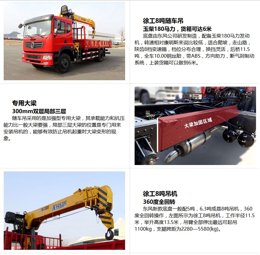 僅選用3800,3950,4700,5100,5600軸距;僅選用10.00-20,10.00R20輪胎;隨底盤選裝駕駛室.選裝箱板結構,選裝上/中座椅操作,可選裝直臂式或折臂式吊機,直臂式吊機:型號/吊機質量(kg)/最大起升載荷(kg)/載質量(kg)分別為:(SPS15800,SQ114,QYS-6.3III,SQS-6.3III,URV630,nicoleV630)/2102/4500/3290(2人),3255(3人);2.(SPS20000,SQ200,QYS-8,SQS-8III,URV800,nicoleV800)/3300/5500/4290(2人),4225(3人);折臂式吊機的分別為:1.(SQ6.3Z,QYS-6.3Z)/2300/4500/3290(2人),3255(3人);2.(SQ8Z, QYS-8Z)/3500/5500/4290(2人),4225(3人);外形尺寸/軸距/前懸/后懸對應關系分別為:7100/3800/1250/2050(1450/1850),7350/3950/1250/2150(1450/1950),8530/4700/1250/2580(1450/2380),9000/5100/1250/2650(1450/2550),9000/5600/1250/2150(1450/1950);發動機對應油耗值為:YC6J180-50/24.3L/100km,YC4EG160-50/24.8L/100km,ISD185 50/24.7L/100km,ISD210 50/24.5L/100km,CA4DLD-15E5/24.0L/100km;側防護:材質Q235,連接方式螺栓連接.后下防護:材質Q235,連接方式焊接連接,斷面尺寸120?0mm,離地高度520mm;該車應安裝具有衛星定位功能的行駛記錄儀.ABS型號為:3631010-C2000,生產廠家為:東科克諾爾商用車制動系統(十堰)有限公司.