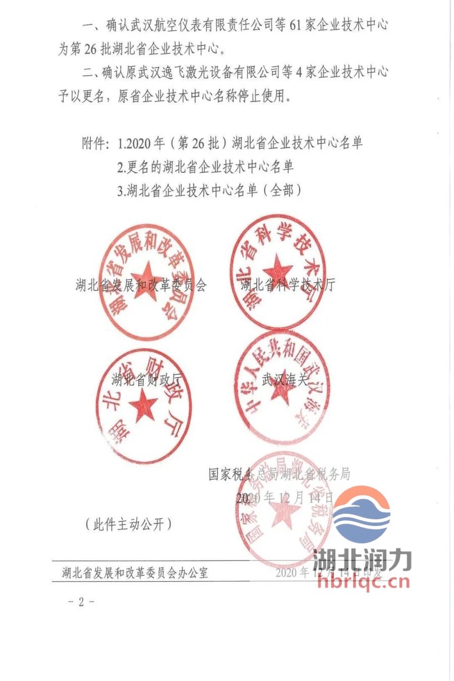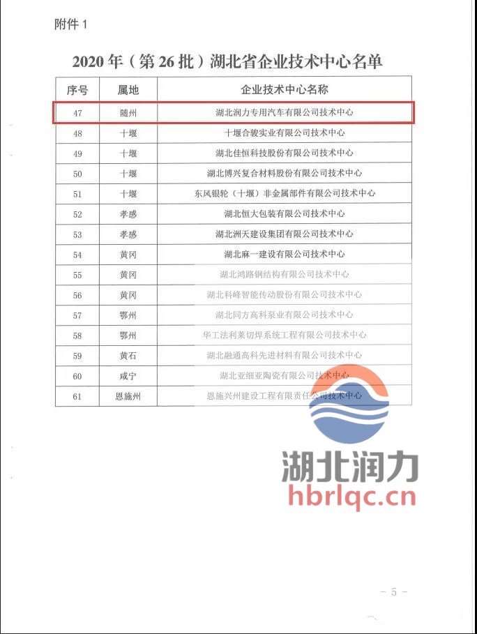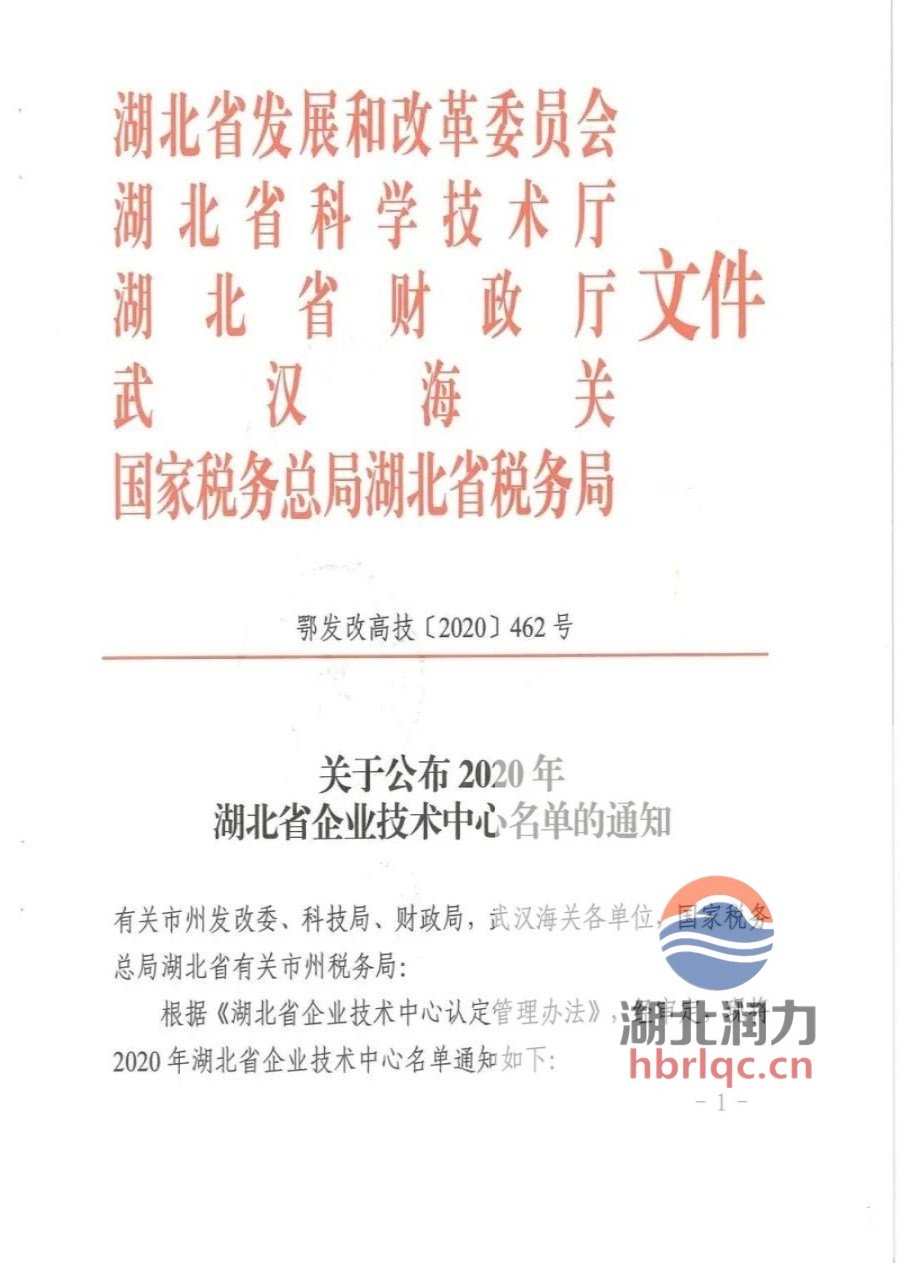 湖北省發展和改革委員會、湖北省科學技術廳、湖北省財政廳、武漢海關、國家稅務總局、湖北省稅務局:關于公布2020年(第26批)湖北省企業技術中心名單的通知,湖北潤力專用汽車有限公司名列其中。
